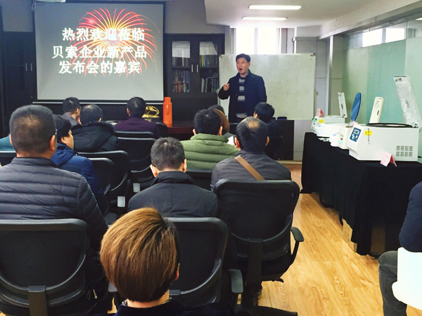 发布会最后一项由营销副总熊明涛先生对公司全自动血库系统及相关产品进行介绍,主要从其工作原理、仪器功能、操作流程、性能优势等几个方面阐述了此套系统的销售卖点及其市场定位。